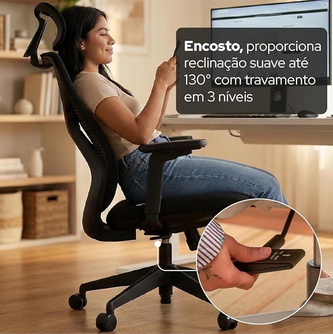 | Reclinação que permite relaxar durante o trabalho. | Pode não ser ideal para pessoas muito altas. |