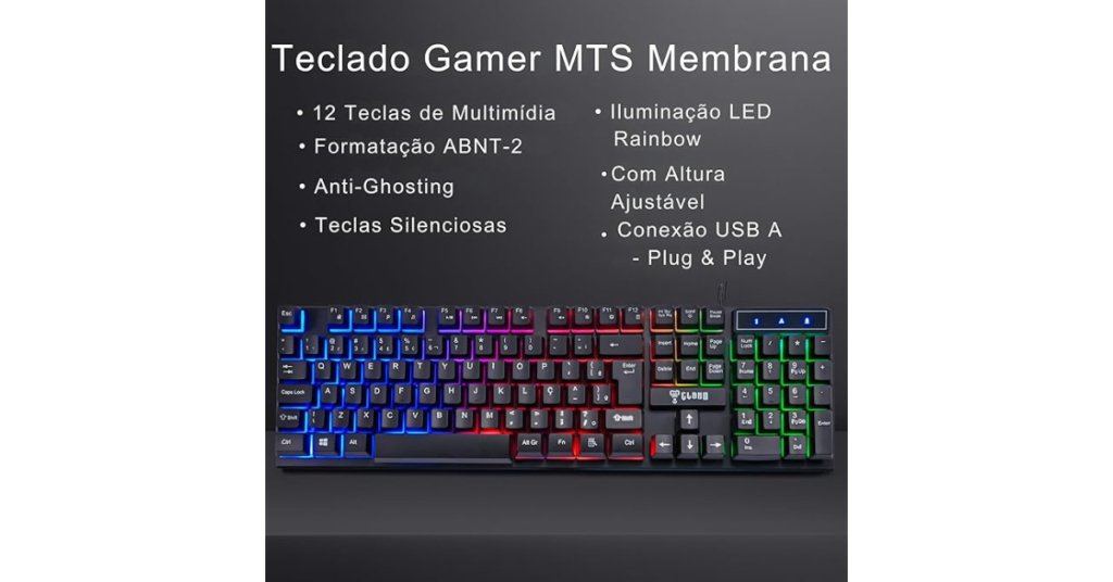 O teclado gamer incluído no Combo GAMER é o Shadow Valley MTS, que se destaca pelo seu design moderno e iluminação RGB LED Rainbow. Esse tipo de iluminação não apenas embeleza o setup, mas também permite uma personalização que pode ser ajustada conforme o gosto do usuário. Com teclas de membrana que oferecem um bom feedback tátil, o teclado é ideal tanto para jogos quanto para digitação.