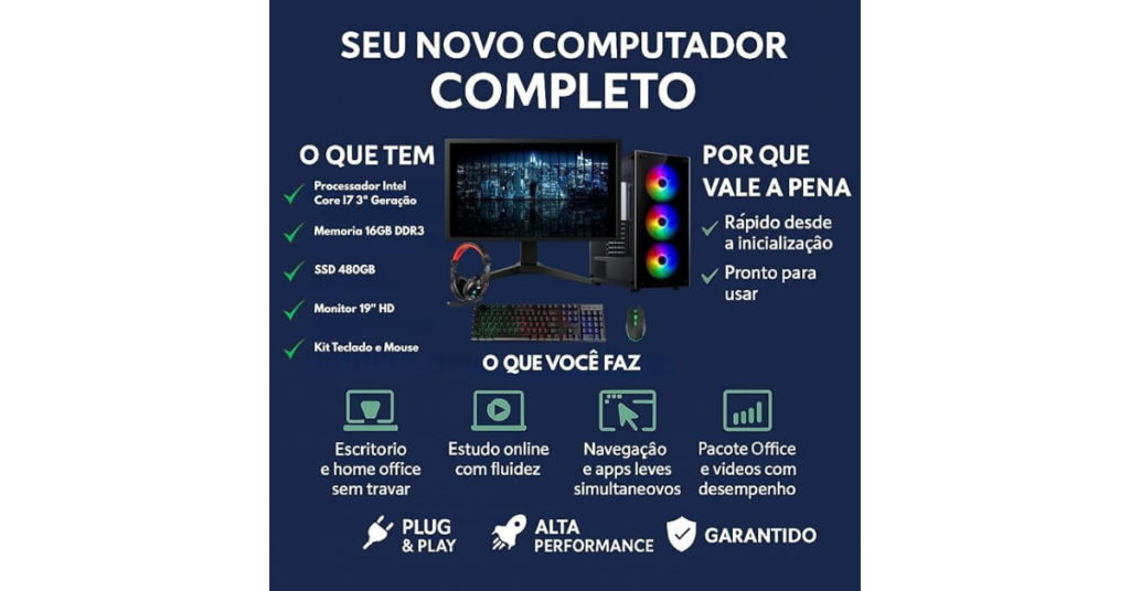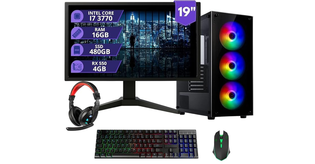 O PC Gamer Completo MRPC, equipado com um processador Intel i7 de 3ª geração, 16GB de RAM, SSD de 480GB e uma placa de vídeo RX550 de 4GB, promete atender tanto iniciantes quanto jogadores mais experientes. Além disso, ele vem acompanhado de um monitor de 19”, oferecendo uma solução completa para quem deseja mergulhar no mundo dos games.
